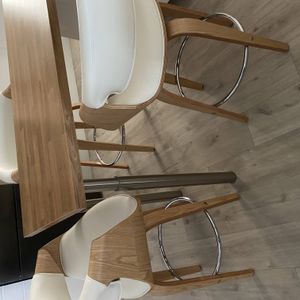 Su diseño original combina materiales y tonos del estilo nórdico con los códigos del estilo contemporáneo. La combinación de la madera clara y el poliuretano blanco aportarán calidez y claridad a tu espacio comedor, mientras que el reposapiés metálico en acero cromado que sirve de reposapiés es el toque moderno del conjunto.